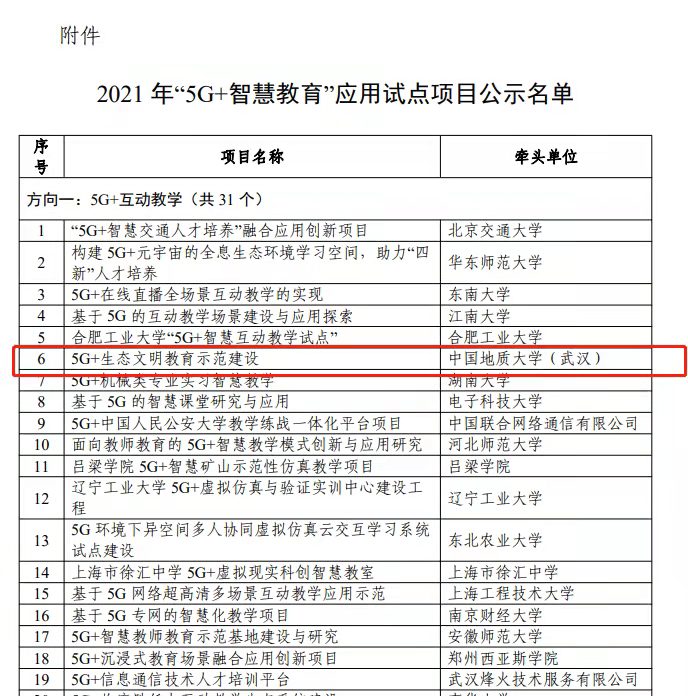地大新聞網訊:近日,工業(yè)和信息化部、教育部聯(lián)合公示2021年“5G+智慧教育”應用試點項目入圍名單,我校牽頭申報的“5G+生態(tài)文明教育示范建設”項目成功入選。