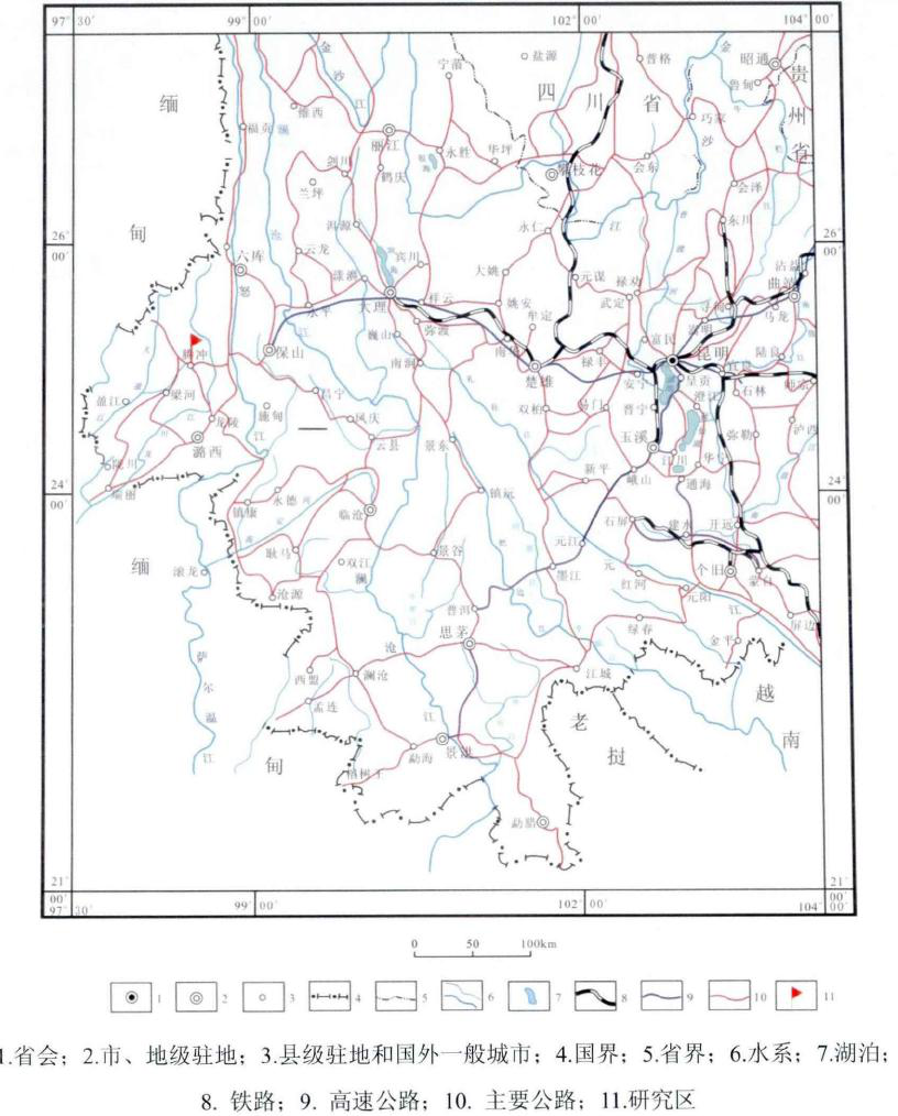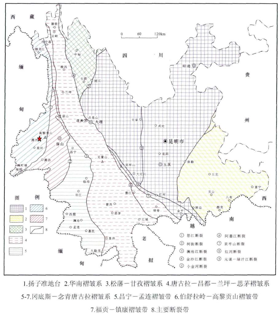 騰沖縣位于高黎貢山西側(cè),總體地勢北高南低,山脈走向為北東一西向及南北向,與區(qū)域構(gòu)造線基本一致。高黎貢山與怒江并列向南蜿誕,高黎貢山峰脊一線海拔多在3000m以上;而怒江河谷海拔僅500—900m,區(qū)內(nèi)最高峰為高黎貢山中段的大腦子,海拔3780.9m;最低點為盈江縣拉沙河與穆雷江交匯處,海拔僅210m;最大高差達(dá)3570.9m,一般高差在400—2000m之間,屬中高山中一深切割地區(qū)。縣城西側(cè)為高中山地貌景觀,谷深坡陸;東側(cè)為中山山地稍為平緩,但切割密度較大;中部為斷陷谷地,河流階地發(fā)育,地勢平坦開闊。騰沖地區(qū)構(gòu)造運動活躍、斷裂構(gòu)造發(fā)育、巖漿活動頻繁、火成巖分布廣泛、新生代火山活動、現(xiàn)代水熱活動異常強(qiáng)烈,溫沸泉眾多。